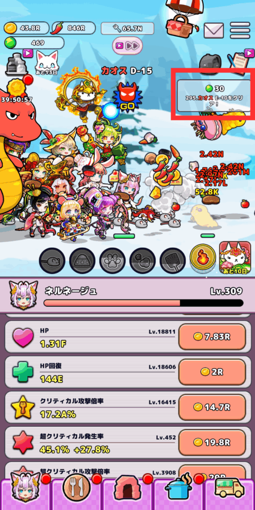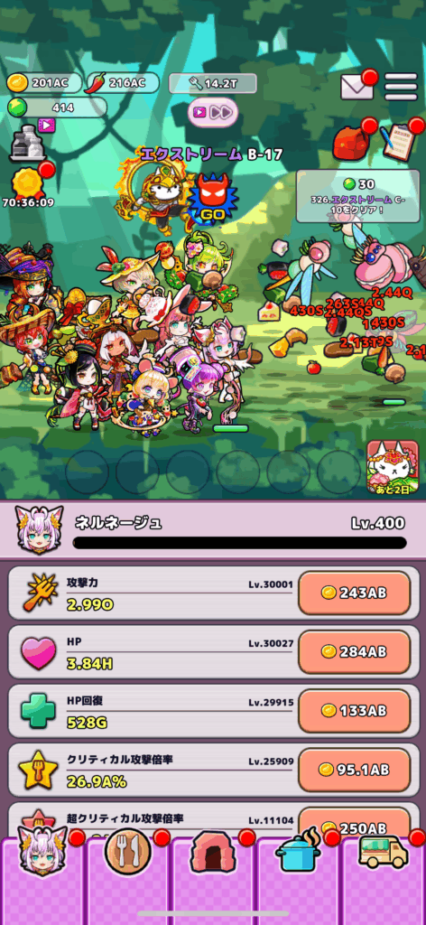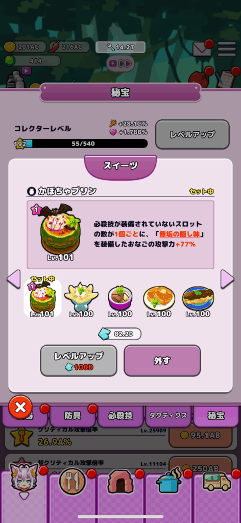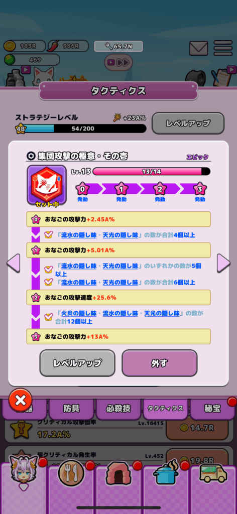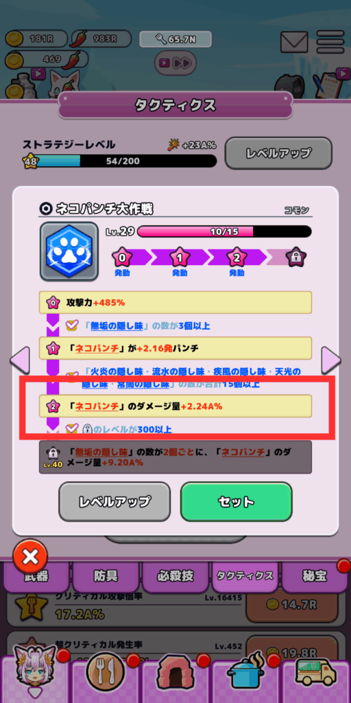 中盤(ネルネージュレベル180~200)くらいになるとおなごのレベル上げも順調に進んでくると思います、おなごたちの隠し味を調整することでネコパンチ大作戦の3枠目を解放させることができると思います。