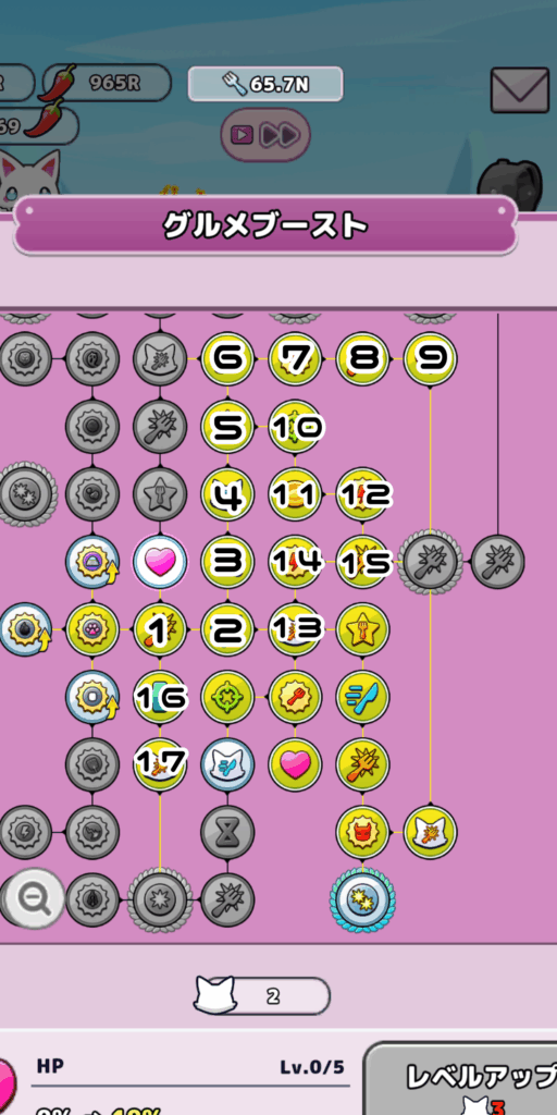 2週目以降は「猫神」や「うまみブースト」といった要素があり1周期目と比較すると序盤を進めやすい特徴があります。そのため、グルメブーストも若干ですが取得順を変更するのがオススメです。