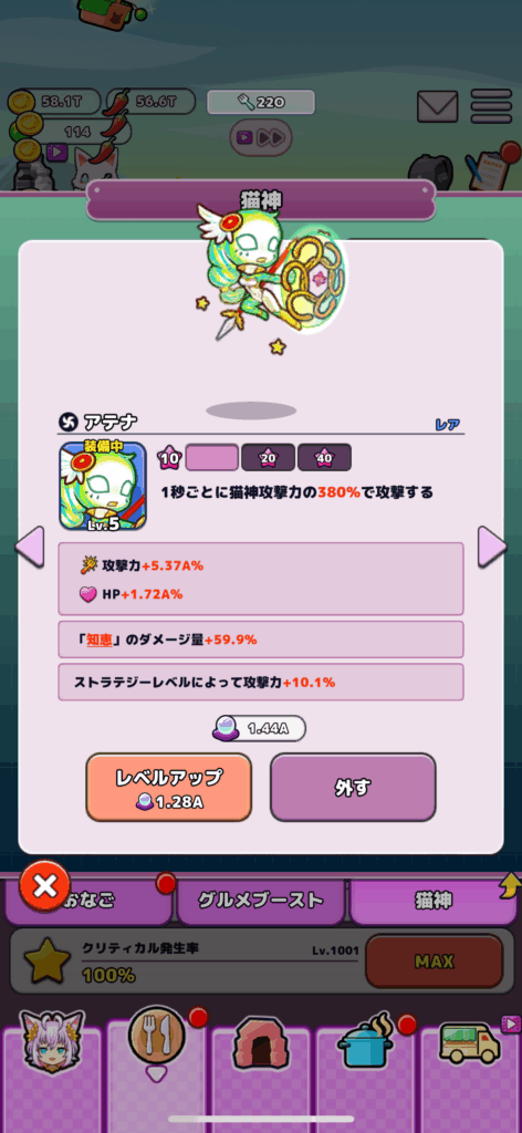 クリティカル率のステータスを1000Lvまで上げないと使用できない超クリティカル発生率をゲーム序盤から50%も底上げ出来るかなり強力な猫神で何回目の転生であってもメンバーに入ってくるような強さだと思います。