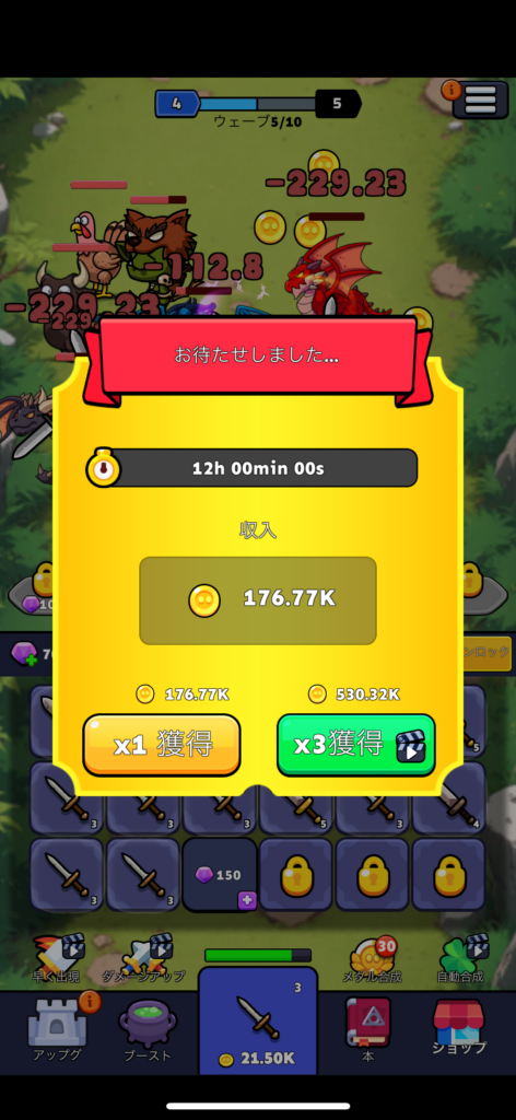 受け取り時に広告を視聴すれば 獲得量が3倍 になるため、普通にプレイするより一度に大量のゴールドを確保できる仕組みになっています。