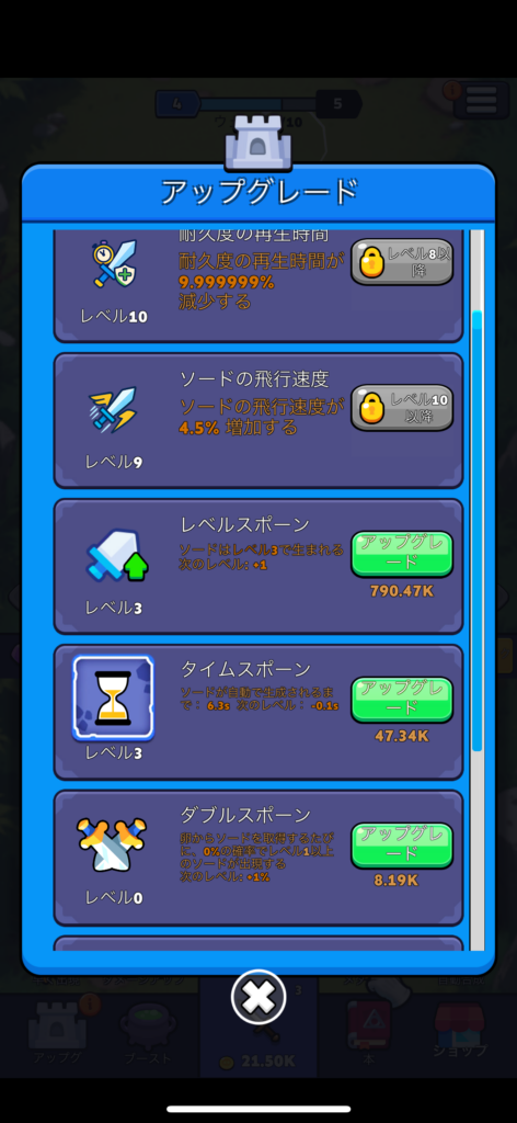基本的には、自動スポーンする剣のレベルを上げる 「レベルスポーン」 を最優先で強化しておけば問題ありません。