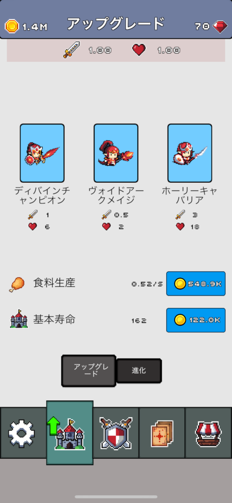 食糧生産の強化や強力なユニットのアンロック、そして他ゲームでいう転生にあたる「進化」を繰り返すことで、少しずつ戦力を伸ばしながらステージクリアを目指していくタイプのゲームになります。