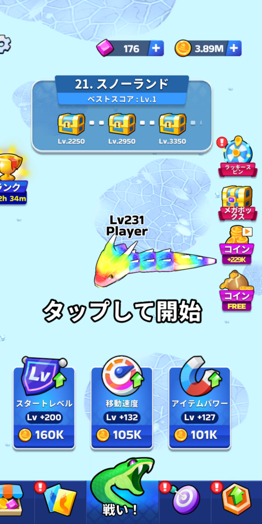 スネーククラッシュは、ヘビを操作して自分よりレベルの低いヘビを食べながら成長し、スコアを競うPvPタイプのゲームです。
