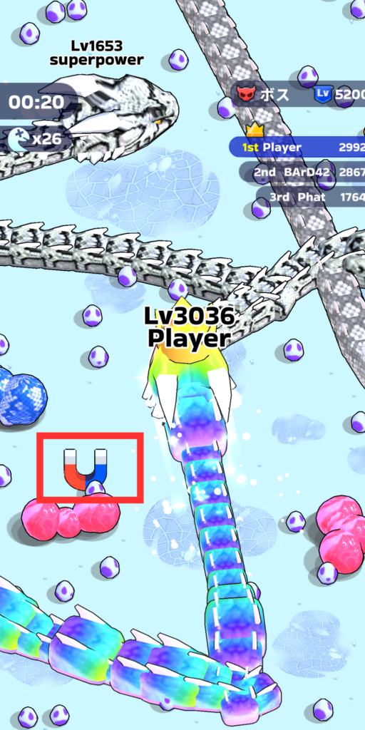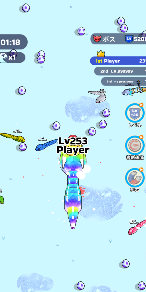 相手のヘビを倒すとレベルアップ効率がかなり良いため、1位を維持できている間は積極的に敵を倒しにいくのがおすすめです。