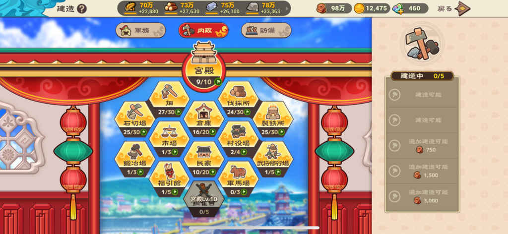 石切場・畑・伐採所・製鉄所といった各生産施設のレベルを最優先で強化する - 土地