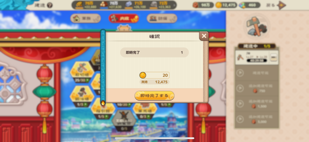 コインを使用することで、建造やレベルアップを即時完了させることができます。