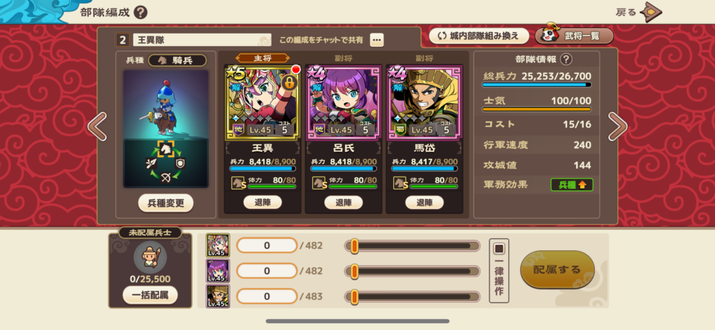 メイン部隊は、特定の兵種適性が高い武将を軸に編成し、