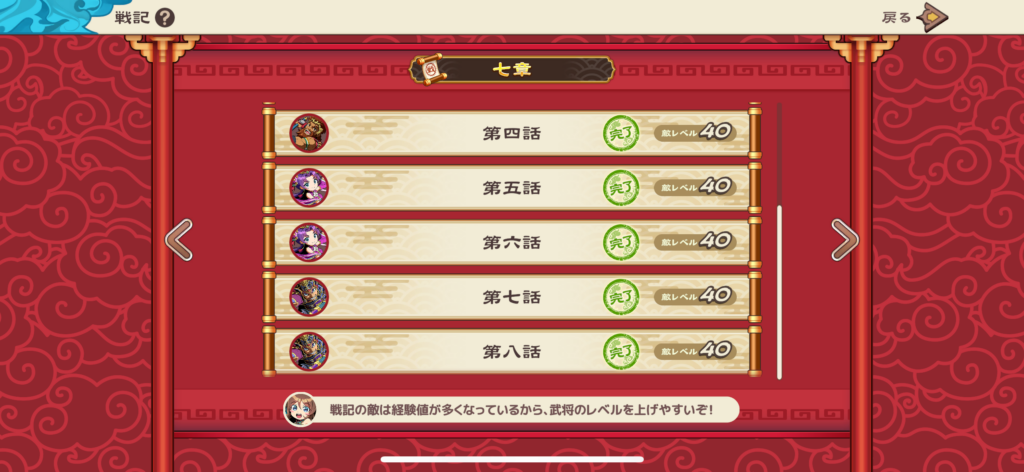 戦記の敵は経験値が多く、レベル上げ効率が非常に良いため、ここを主軸に進めるのが一番楽です。